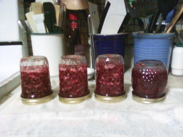 Fill sterilized jars with hot jam mixture. Clean top of jars, add lids, and screw on rings. At this point you can do one of two things: (1) turn the jars over on their tops and let the heat seal the jars or (2) process in water canner for 10 minutes. This recipe will make 2 pints or 4 – 1/2 pints.