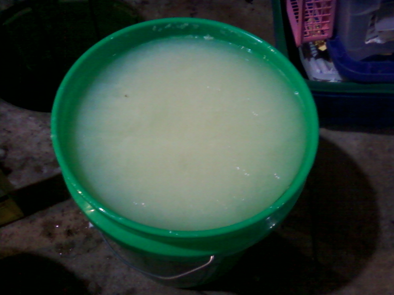 Fill bucket to top with more hot water. Stir, cover and let sit overnight to thicken.