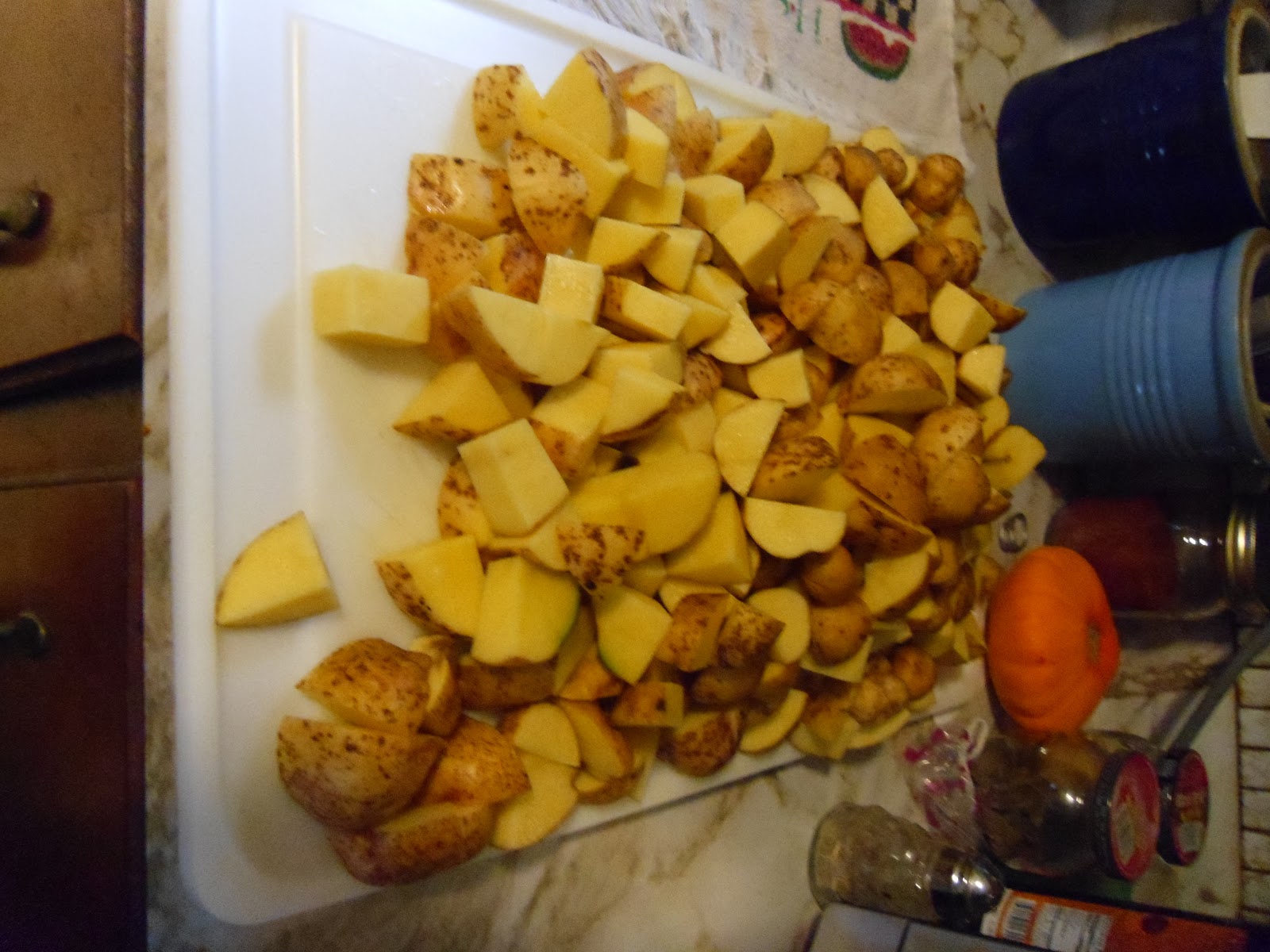 2. Peel the potatoes if you would like. (I don’t, but that is a personal preference.) Cut the potatoes into similar size pieces that you can get into the jar. I do roughly one-inch pieces of potatoes. Toss the lids into the simmering pot of water.