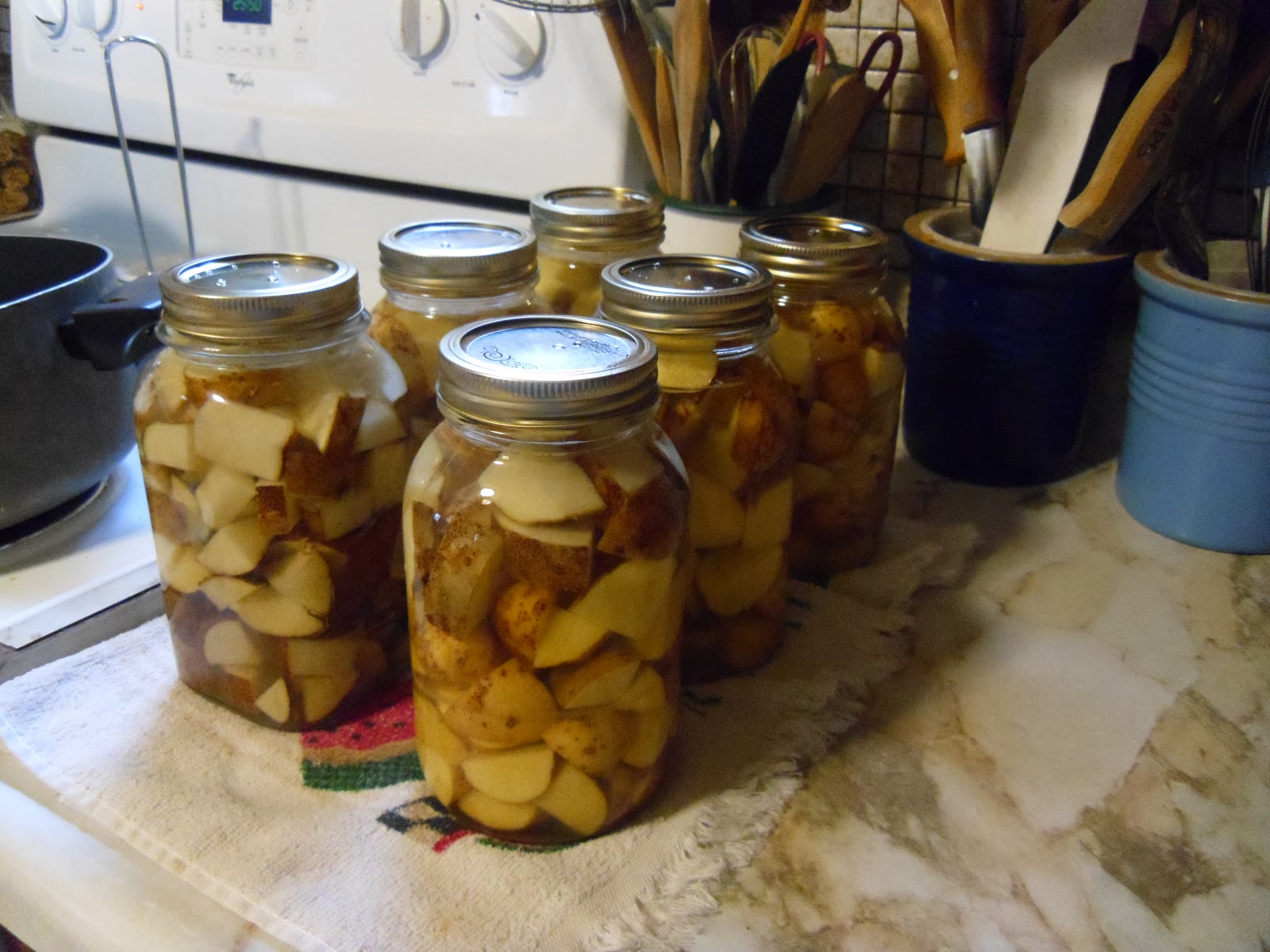 6. Process the potatoes at 10 pounds pressure for 40 minutes if using the quart jars or 35 minutes if using pint jars. Pressure may need to be adjusted according to altitude. When done, remove canner from heat and let the canner cool before opening the canner. Take the jars out and let cool.