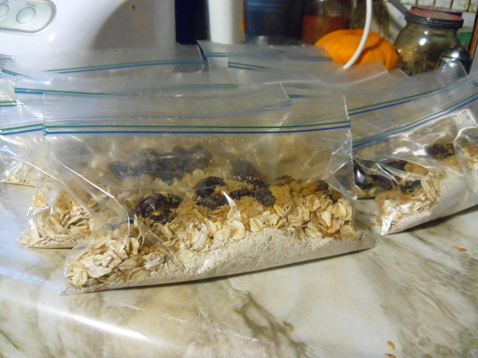 I use snack size bags to make the individual packets. Into each packet you want to add: