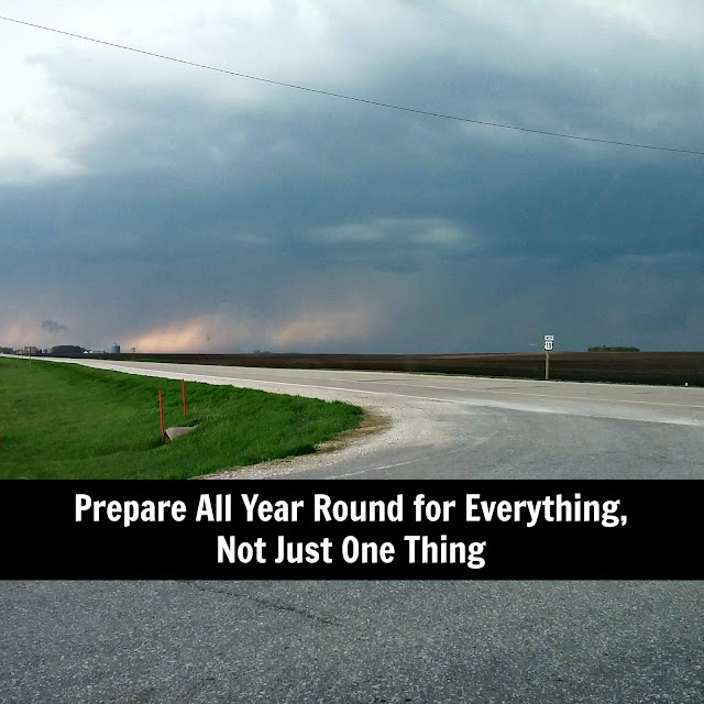 I prepare for everything year round. I might prepare more for things depending on the season or current conditions in our country. During the Spring I prepare for storms, tornadoes, the upcoming hot weather, constantly changing temperatures, and the summer schedule. I also get my garden ready and start planting to have food for the winter.