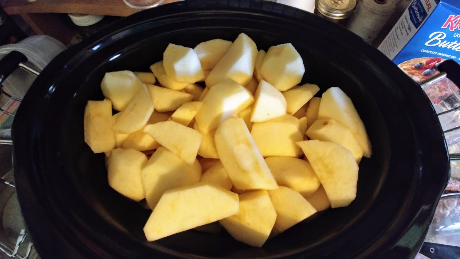 1. Place the apples in the slow cooker. I sometimes run my apples through an apple peeler/corer/slicer and put the apples in the slow cooker. Other times, I just peel, chop into chunks, and put in the slow cooker. When the slow cooker is full, I put the lid on.