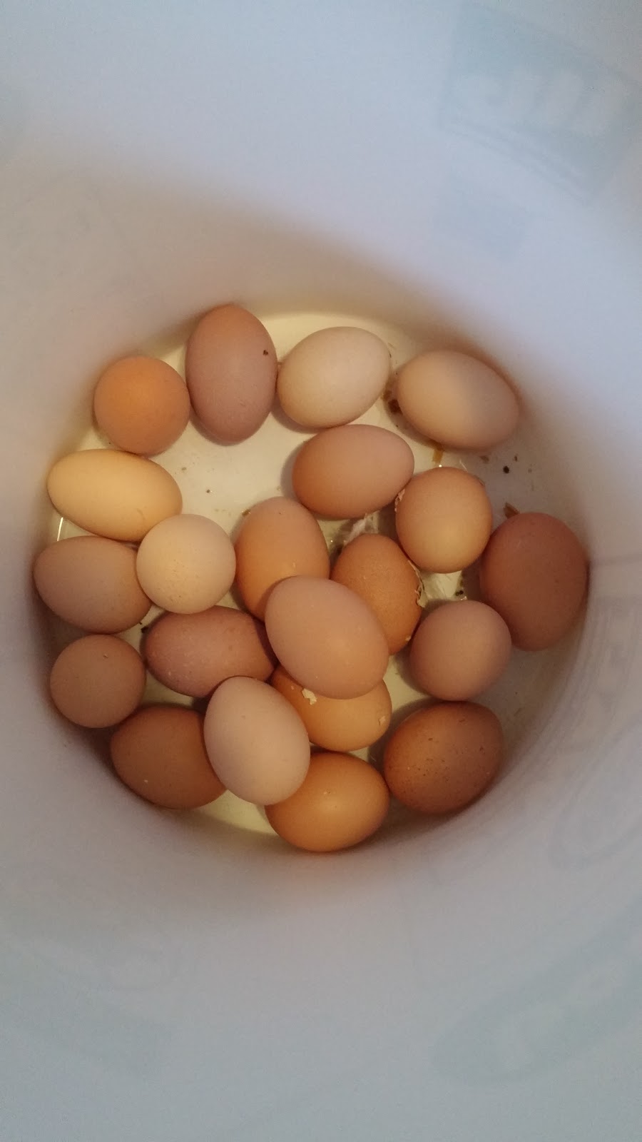 Below is a couple days worth of eggs. While I sell them or send home with the college kids some of the extras, we still have to step up and eat them.