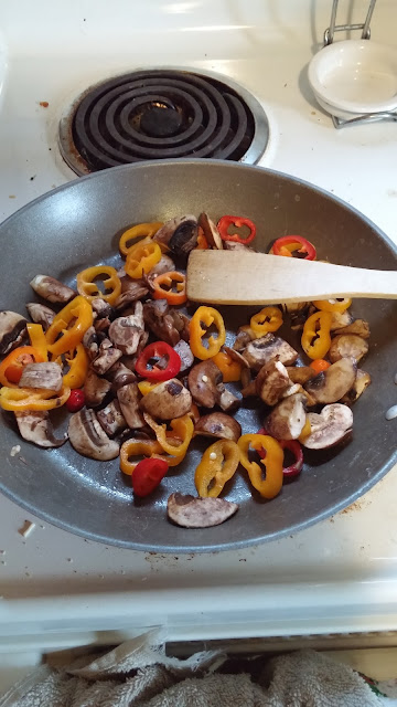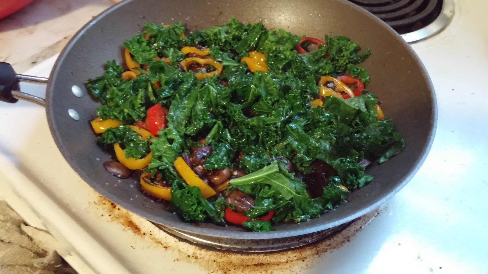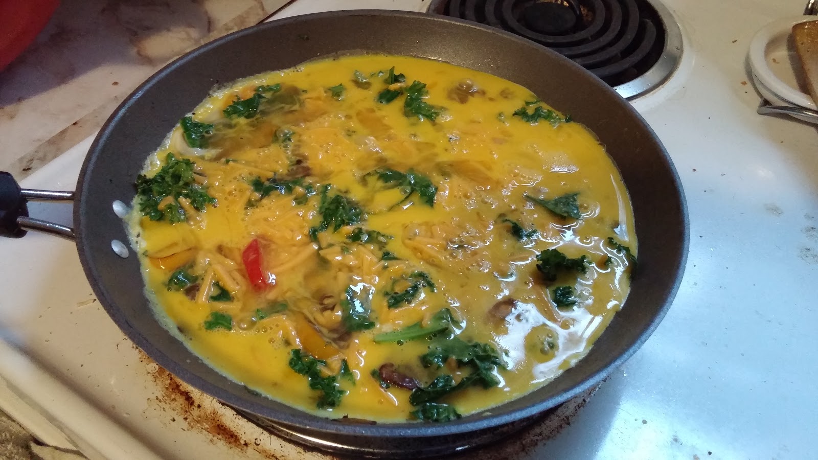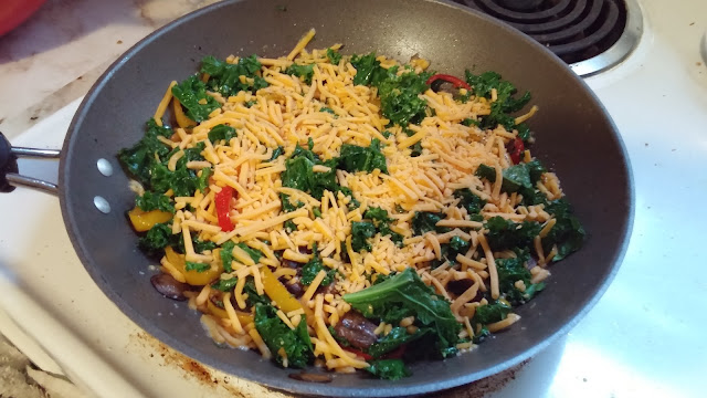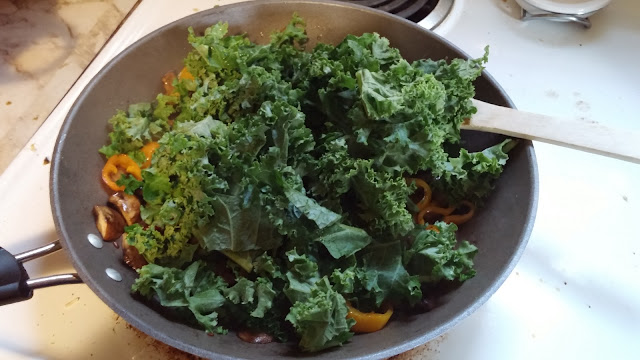 In a nonstick skillet or a very well seasoned cast iron skillet, heat your pan to medium high. Add the fat of your choice, allow it to melt, and add your vegetables. I had a half a container of sliced bella mushrooms, four mini bell peppers, and kale. I started the mushrooms and peppers first until they were soft and cooked a bit.