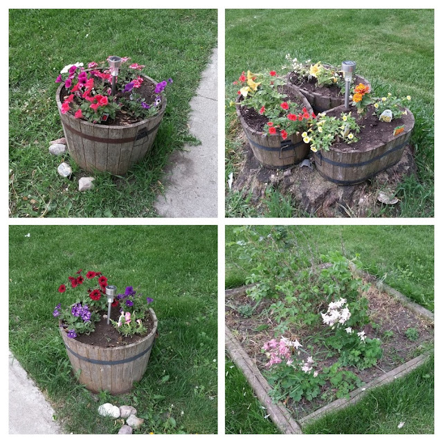 We got all the flowers planted. I need just a few more for the one bed I cleaned out (lower right corner). That particular bed has columbines and wild roses growing there right now. I planted three new perennials in there, but it could benefit from three more perennials. The half-barrels on the left hand side are flowers I got for Mother’s Day from Dane and Rob. The orange flower on the upper right hand picture is also from Dane. I went to Country Gardens and got some more flowers to match it and fill in those planters. I also got a yellow gerbena daisy plant from Jordan that I need to bring outside.