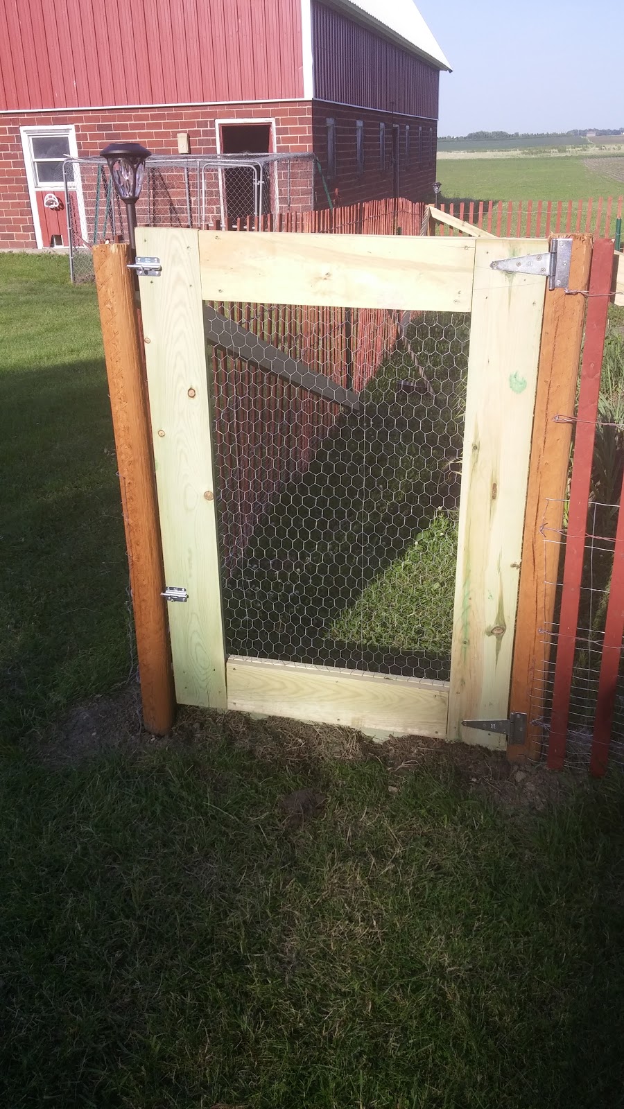 Rob built the gate to the garden using the 1″ x 6″ boards and chicken wire fence. We decided to use two barrel bolts to keep the gate closed. If you look very closely at the bottom of the gate, Rob buried a 1″ x 6″ in the ground to close the gap between the gate and the ground. We don’t need to offer a way in for the rabbits. We also have a 2″ x 4″ across the bottom inside the gate for the gate to rest against and more support for the gate posts.